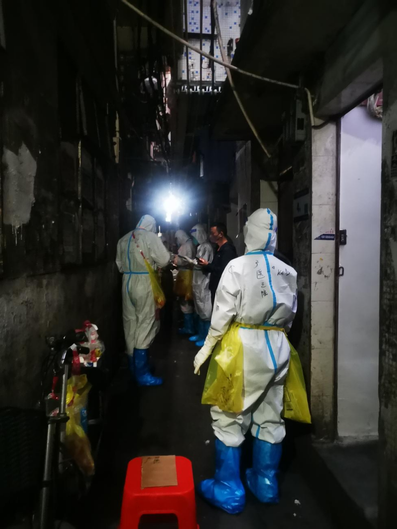 在海珠封控区,许多城中村握手楼比较老旧、没有电梯,入户采样对象住所分散,突击队员只能层层爬楼,户户筛查。突击队员聂万峰在入户采样中发现了一名身体虚弱的独居老人,在确认了老人生命安全后,他立刻联系志愿者和居委,协助将老人转运到隔离救助站安置,直到老人得到妥善安置后,才又继续回归“扫楼”工作。