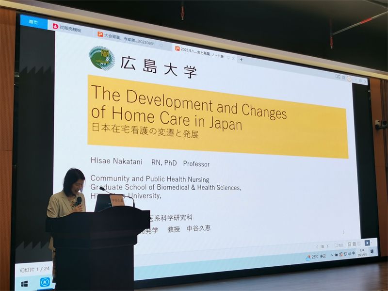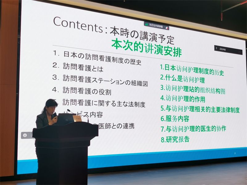 二宫寿美副教授做了题为《日本访问护理制度》的报告。她表示,访问护理能够改善疾病的管理、疗养环境以及提供必要的社会咨询,同时能够促进照顾者的健康管理,减轻照护负担。