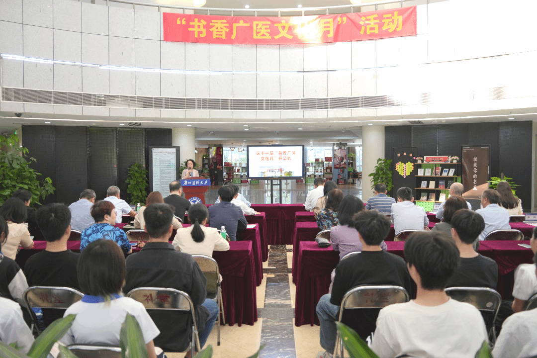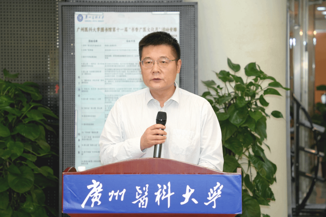 赵醒村校长在讲话中表示,阅读是塑造一流人才、建设一流大学的重要源泉,学校始终坚持立德树人根本任务,大力推进书香校园建设。同时,广大师生积极参与省、 市阅读推广大赛,并斩获多个奖项,书香校园氛围日益浓厚。学校举办第十一届“书香广医文化月”,旨在进一步提升师生的阅读兴趣和文化素养,为学校高质量推进“双一流”建设提供有力支撑,希望广大师生积极养成多读书、读好书的良好习惯,深研学科经典以夯实专业根基,广涉人文社科著作以培育跨界思维,将阅读成果转化为创新实践的内在动力,成长为兼具专业素养与人文情怀的新时代医学人才。并寄语图书馆持续加强内涵建设,努力将自身打造成为支撑学术创新的知识中枢、传承医学精神的文化殿堂、培育医学创新人才的成长摇篮,为学校高质量发展注入持久动力。