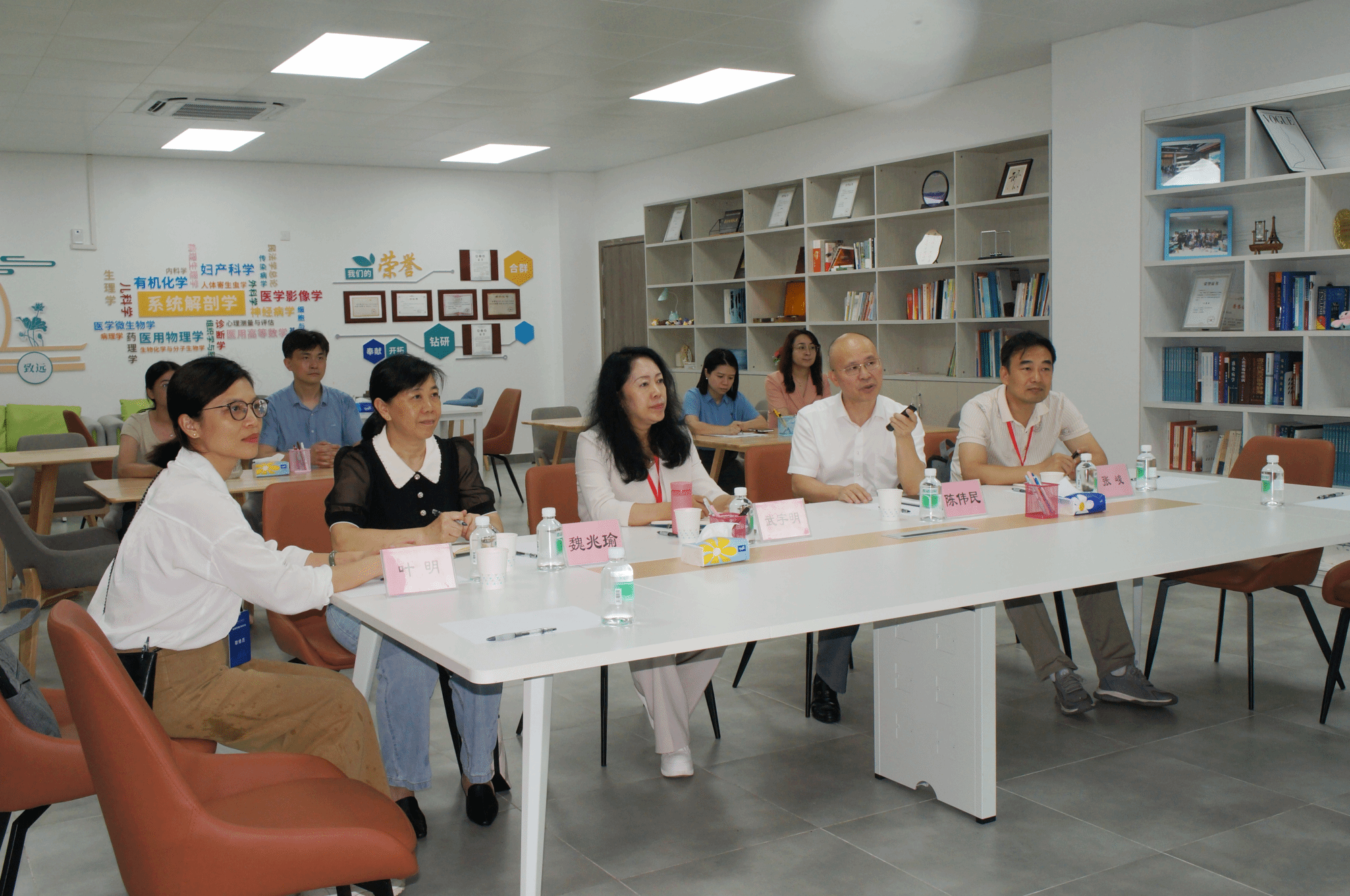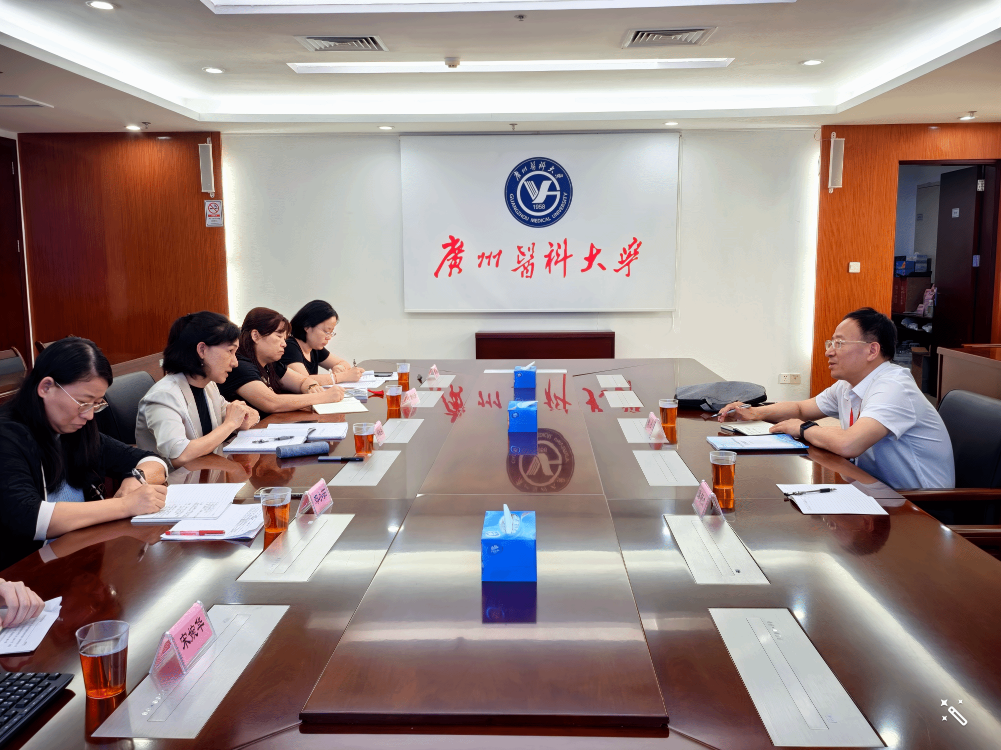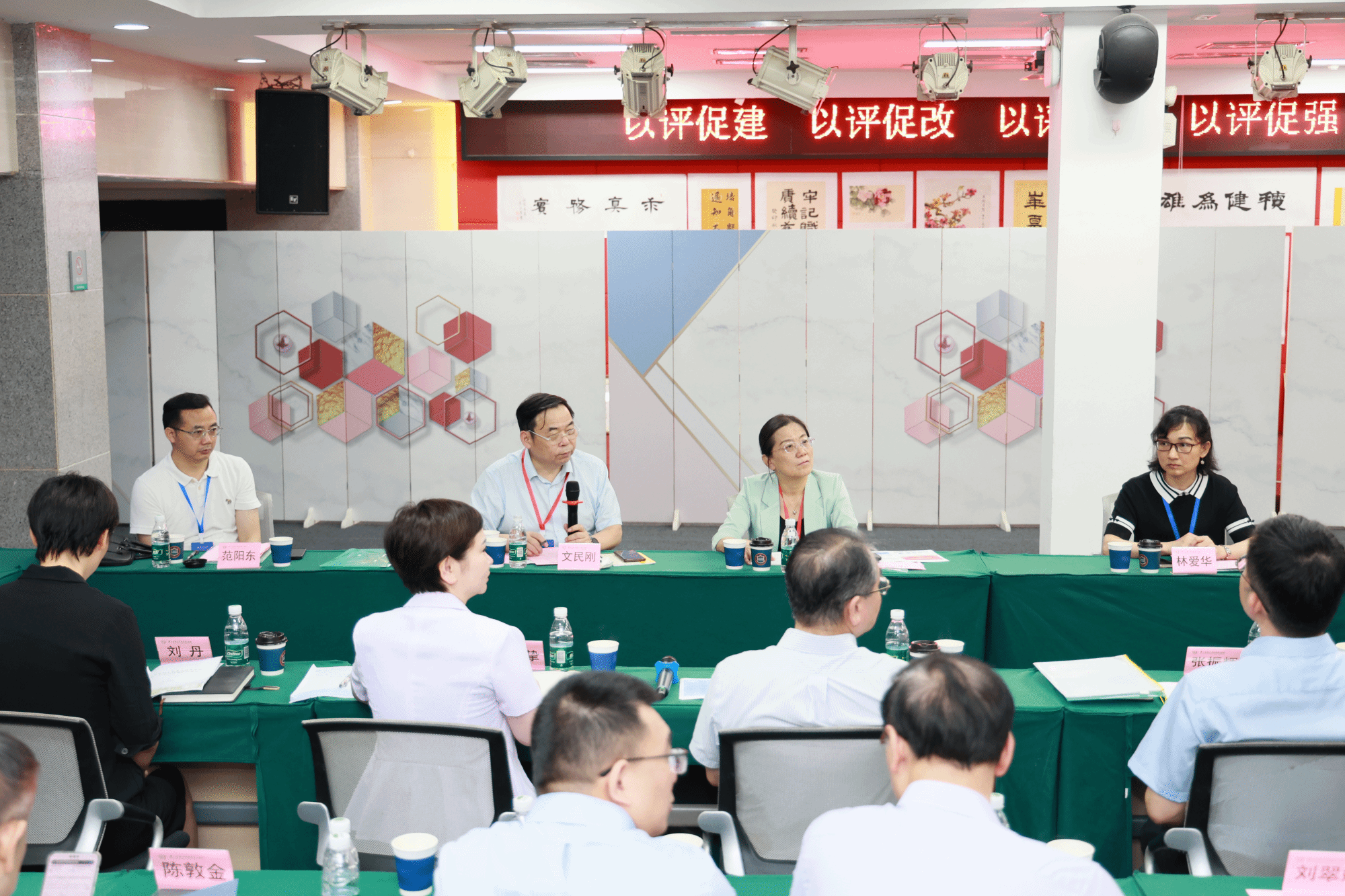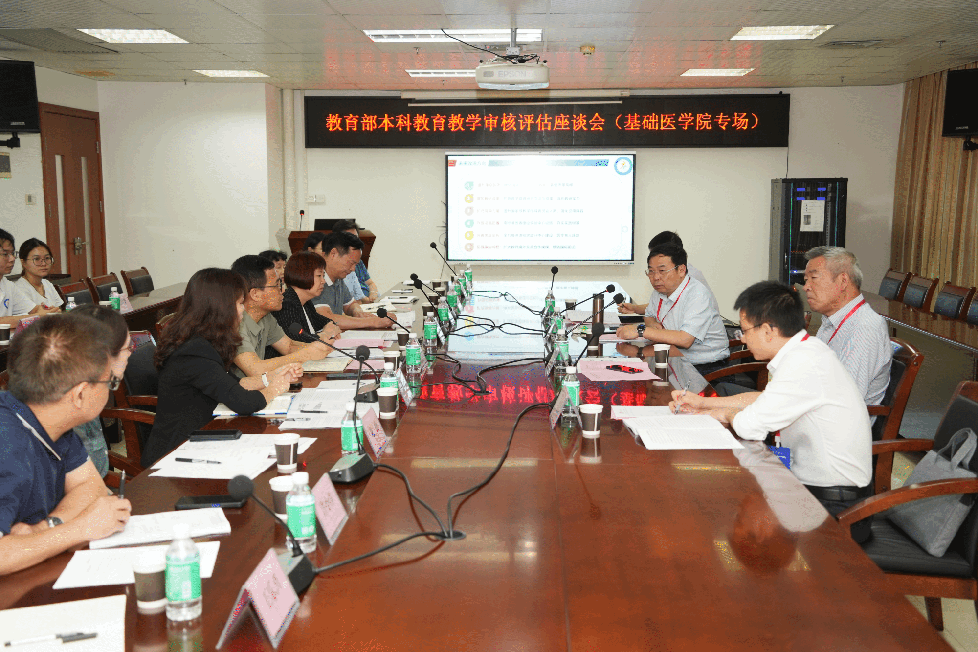 广东省教育厅高等教育处副处长吴华明、广州市教育局市管一级调研员林平等专家、领导,专家组项目管理员广州中医药大学中药学院党委副书记王建刚、秘书广东医科大学教务部七级职员尹晓钧、见习项目管理员及秘书华南农业大学珠江学院教务处副处长张峻、广州商学院质量管理与评建办公室主任助理陈珊,学校领导,各党群部门、行政部门、教辅部门、学院和附属医院主要负责人,分管教学和学生工作的相关人员参加会议。