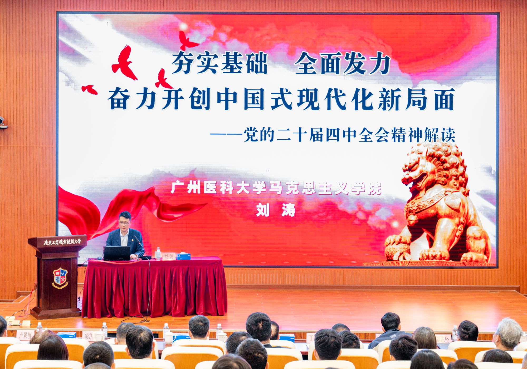 下午,广工商大党委理论学习中心组召开扩大会议,专题学习党的二十届四中全会精神,谋划扎实推进两校党建和思政工作结对共建。会议邀请广东省青年讲师团成员、伟德国际马克思主义学院副院长刘涛教授作《夯实基础 全面发力 奋力开创中国式现代化新局面》专题报告。该校党政领导、校长助理、全体中层干部、各级党组织书记、部分党员代表、全体辅导员和思政课教师参加会议,伟德国际结对共建工作组有关成员列席会议。
