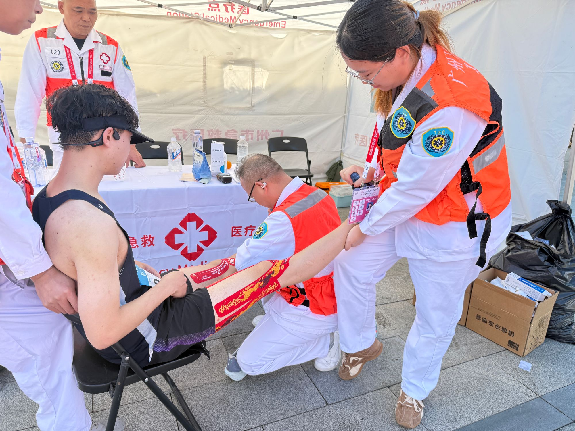 广医辅助医疗志愿者是赛道上最亮眼的“生命红”,扮演着赛道“健康小站”的重要角色。