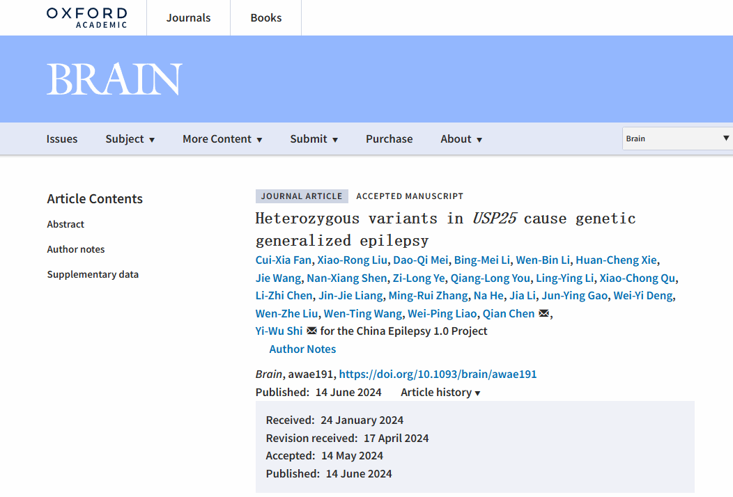 本网讯 6月14日,伟德国际英国附属第二医院神经致病基因与离子通道病教育部重点实验室石奕武教授团队题为Heterozygous variants in USP25 cause genetic generalized epilepsy的论文在神经科学顶级期刊BRAIN上在线发表。GGE是临床上一种常见的癫痫类型,但其病因及致病机理不清楚。该研究首次报道去泛素化酶基因USP25杂合变异导致遗传性全面性癫痫(GGE)及其机理,对癫痫的诊断和精准治疗有重要意义,也为癫痫致病机制的研究提供了新的探索方向。这是该实验室发现的第9个新的人类疾病致病基因。