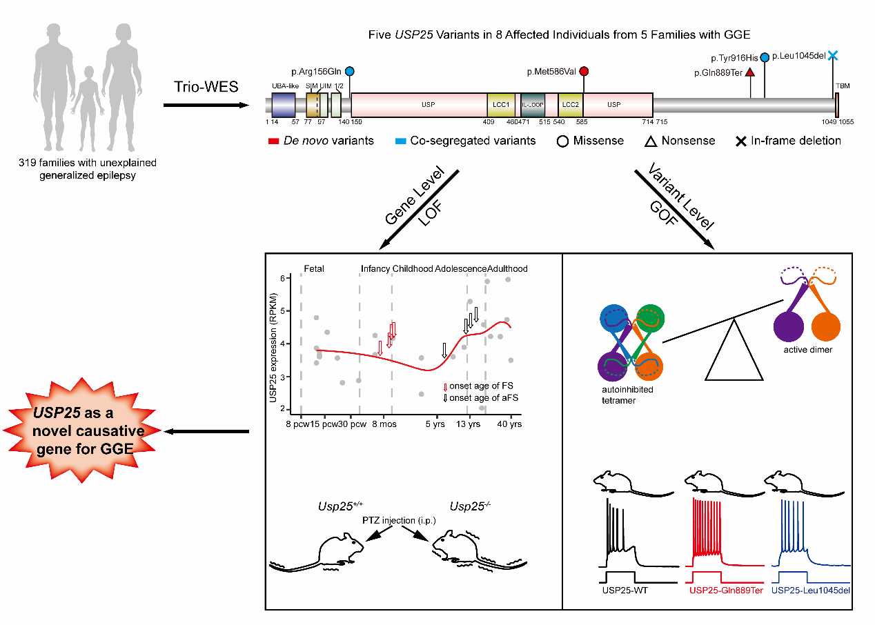 该研究对319例原因不明的全面性癫痫患者进行三人组全外显子测序(Trio-WES),运用廖卫平教授建立的新的候选基因筛查方法,在5个不相关的GGE家庭中发现USP25基因5个变异,其中2个为新生变异和3个为疾病共分离变异,累及8名个体,提示USP25基因为GGE新的候选基因。进一步研究发现USP25基因的时空表达与患者的起病年龄及全面性发作特点一致、Usp25敲除小鼠癫痫易感性增加、变异导致USP25表达、定位及结构改变及小鼠神经元兴奋性增高,从临床、基因和变异的层面证实USP25是遗传性全面性癫痫新的致病基因。
