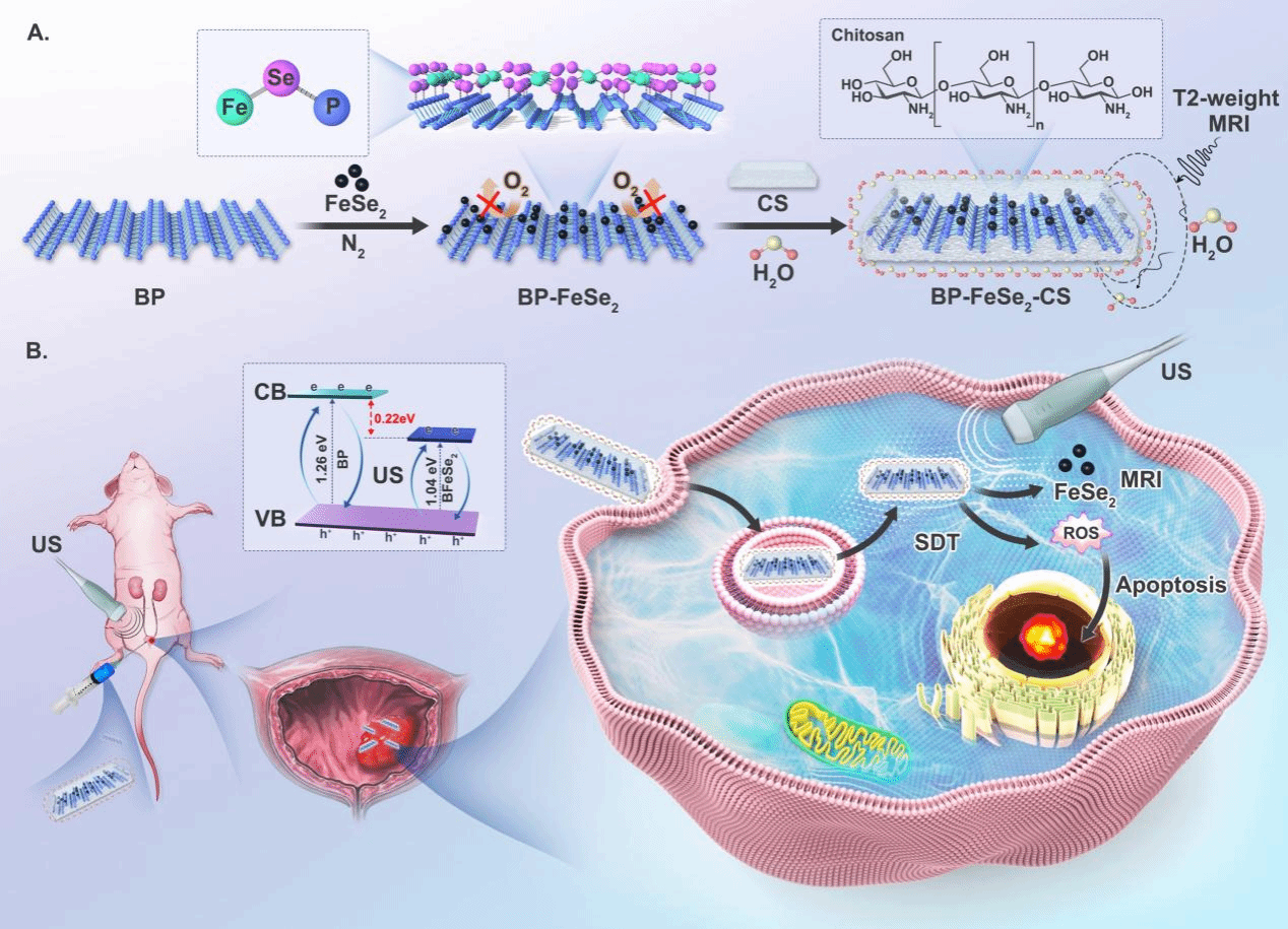 此外,为了提高SDT的抗肿瘤作用和膀胱癌的诊断能力,作者通过P-Se键将FeSe2锚定在黑磷(BP)上,合成了一种基于BP的异质结声敏剂(BFeSe2)。结果表明,BFeSe2在超声(US)照射下,对膀胱癌细胞有明显的细胞毒性。在皮下肿瘤模型和原位肿瘤模型中,BFeSe2对肿瘤生长有明显的抑制效果。此外,BFeSe2还可增强T2加权MR成像,实现对膀胱癌的监测和指导治疗的作用。总的来说,BFeSe2声敏剂结合MRI进行精确治疗,在膀胱癌的治疗中具有较强的临床应用潜力。该研究以Ferrous selenide stabilized black phosphorus heterojunction sonosensitizer for MR imaging-guided sonodynamic therapy of bladder cancer为题发表在医学一区期刊Biomaterials Research(DOI: 10.34133/bmr.001)上。伟德国际硕士研究生吴思丞为第一作者,南山学者刘宏星研究员为最后通讯作者。