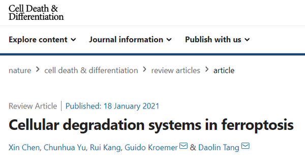 Cellular degradation systems in ferroptosis发表于Cell Death &Differentiation期刊,文章系统地介绍了蛋白降解系统在铁死亡中的作用,提供了调节铁死亡降解系统的信号和机制的最新概况,为疾病治疗策略开辟了新的视野。