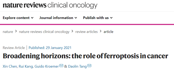 Broadening horizons: the role of ferroptosis in cancer发表于Nature Reviews Clinical Oncology(IF: 53.276)期刊。文章介绍了铁死亡的三个关键分子机制,描述了铁死亡与肿瘤相关信号通路之间的串扰。同时,作者对铁死亡在化疗、放疗和免疫治疗中的潜在应用进行讨论并提出了对铁死亡在肿瘤领域的展望。