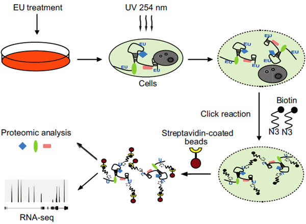 该研究团队利用核酸标记,通过点击化学反应将新合成的RNA连接生物素,经过链霉亲和素偶联磁珠的分离,得到相应被标记 RNA分子和与其相结合的蛋白分子。应用该技术,研究者捕获了包括非polyA RNA在内的新生转录本RNA及其结合蛋白谱,同时发现细胞分裂调控因子作为新的RNA结合蛋白有结合非polyA RNA的潜能。另外,通过对新生RNA结合蛋白组的分析,研究团队还发现调控代谢的相关酶类有结合新生RNA的能力,暗示着它们可能与RNA的转录或者剪接加工等过程存在一定的联系。