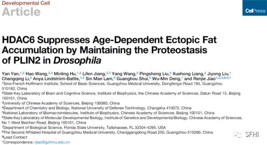 广医在线讯 近日,伟德国际广州霍夫曼免疫研究所焦仁杰实验室关于脂肪过度积累引起早衰的最新研究成果“HDAC6 SuppressesAge-Dependent Ectopic Fat Accumulation by Maintaining the Proteostasis of PLIN2in Drosophila”发表在国际知名期刊Developmental Cell上。