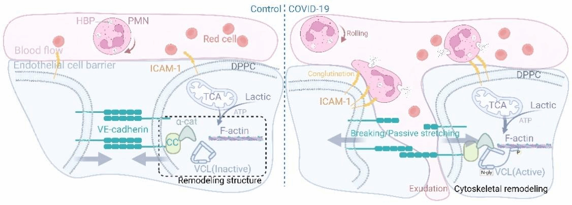 研究发现VCL/ICAM-1的激活可重塑细胞骨架,促使炎症细胞浸润和气血屏障通透性增加,最终引发不同程度的肺实质渗出。这可能是导致患者呼吸困难、咳嗽等呼吸相关症状的关键因素。