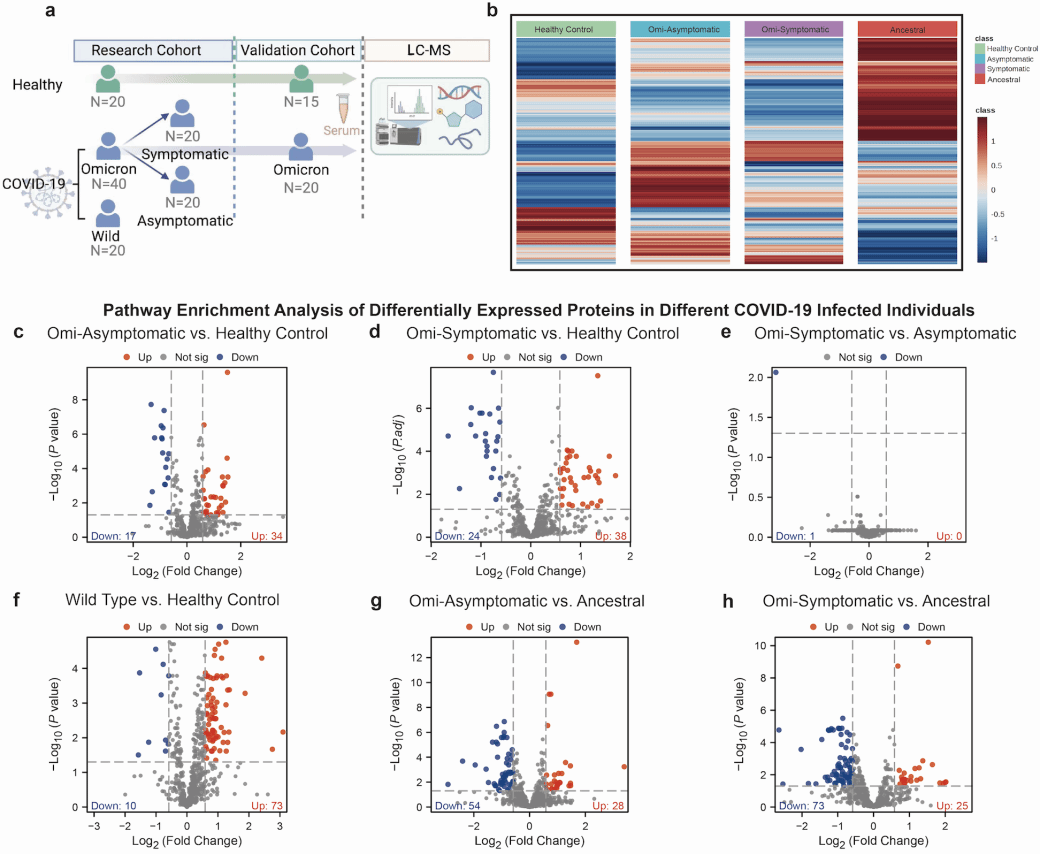 本研究共纳入60例Omicron变异株感染者、20例原始毒株感染者及35例健康对照者。分别构建发现队列与验证队列。通过蛋白质组学、蛋白修饰组学与代谢组学联合测序,系统筛选并鉴定出与肺实质渗出密切相关的特征性蛋白通路—VCL(钙粘附蛋白)/ICAM-1(细胞间黏附分子-1)。